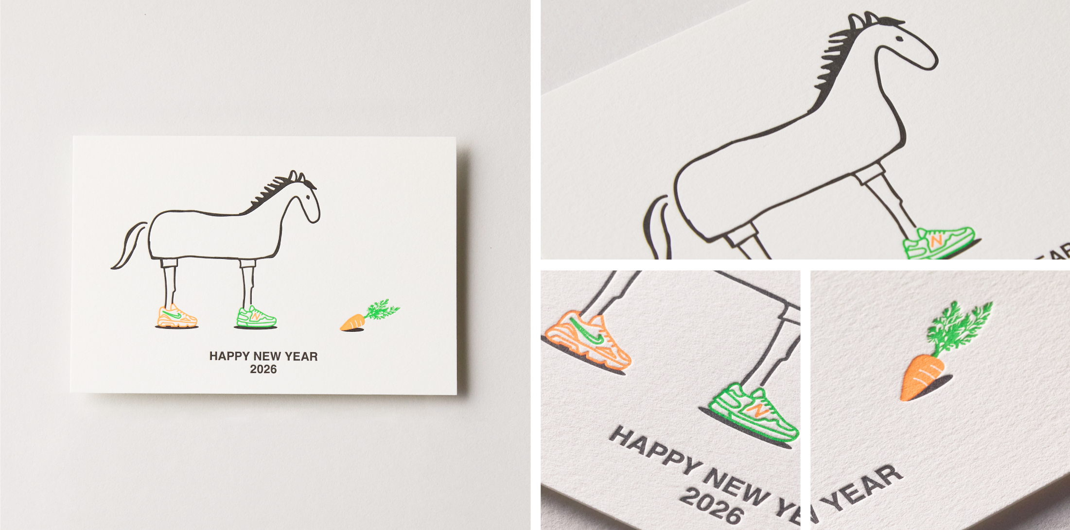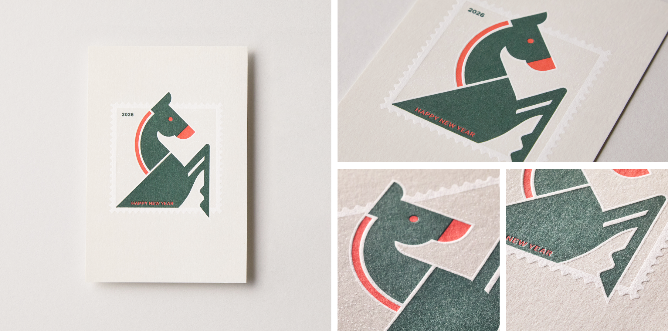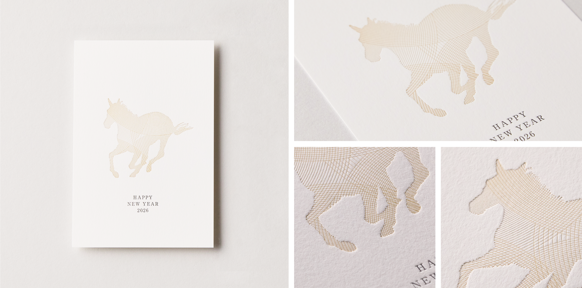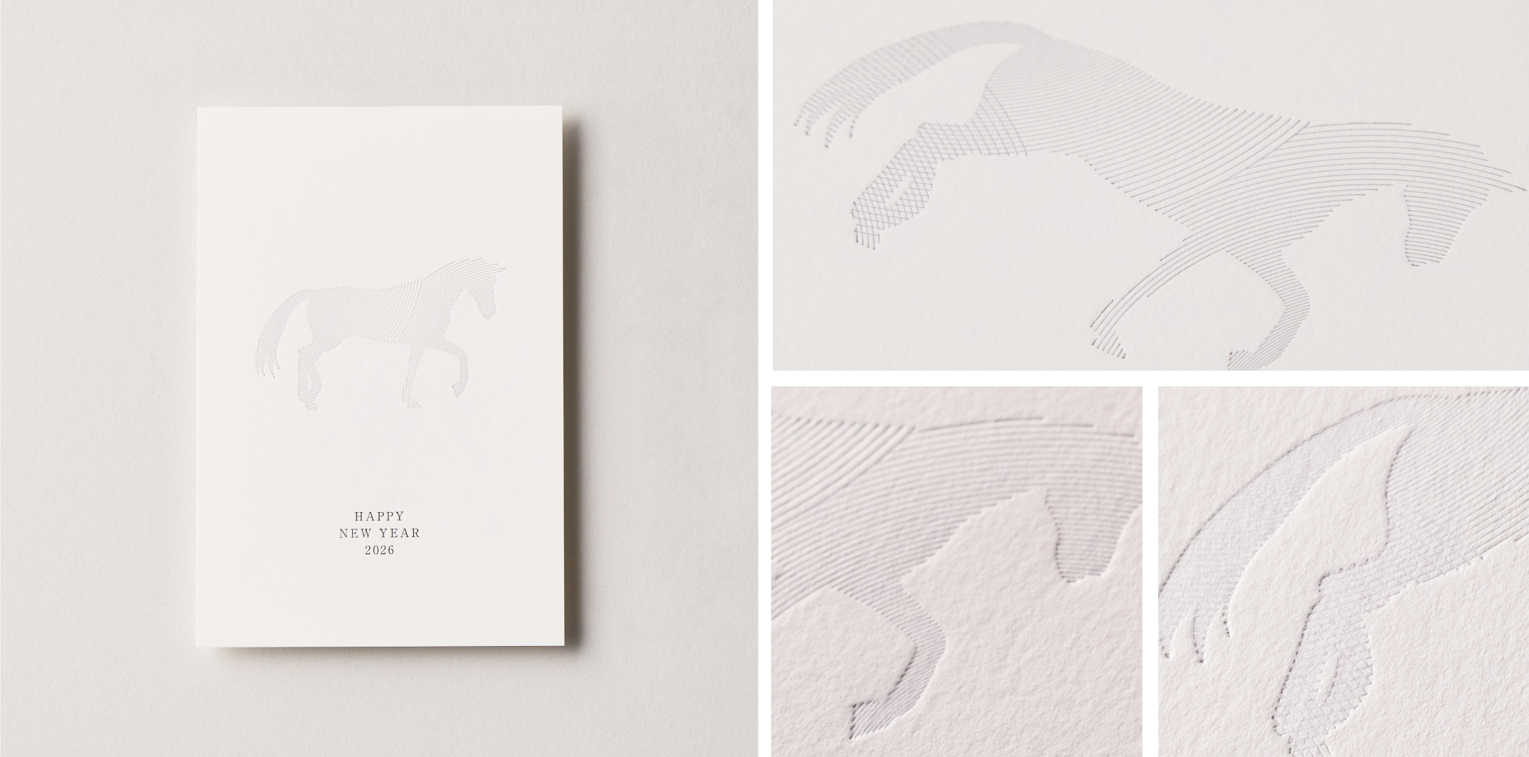 「丙午」のシルエットを繊細な線のみを用いて活版印刷で表現した年賀状。