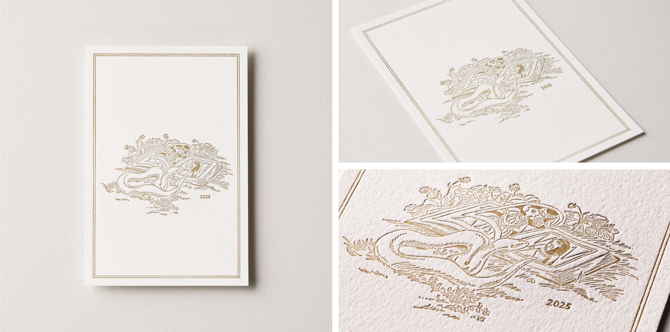 活版印刷と相性の良いふんわりとしたコットン紙に、ゴールドのインキ1色の活版印刷で仕上げた