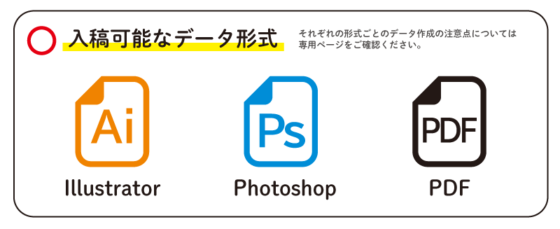 それぞれの入稿形式の注意点については、ご利用ガイド内『ご入稿データ形式ごとの注意点』のページをご確認ください。